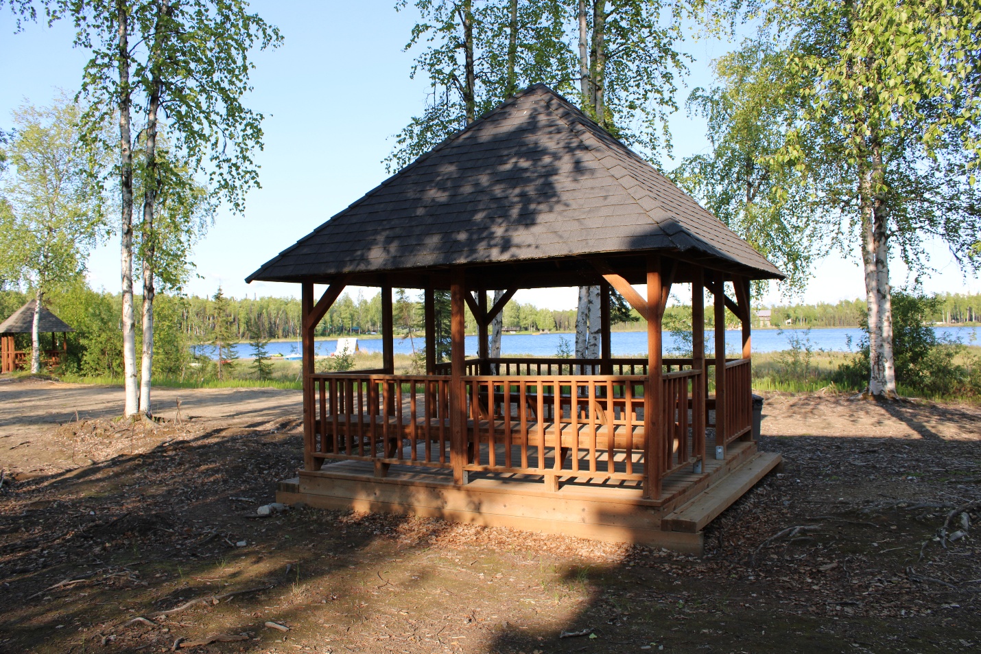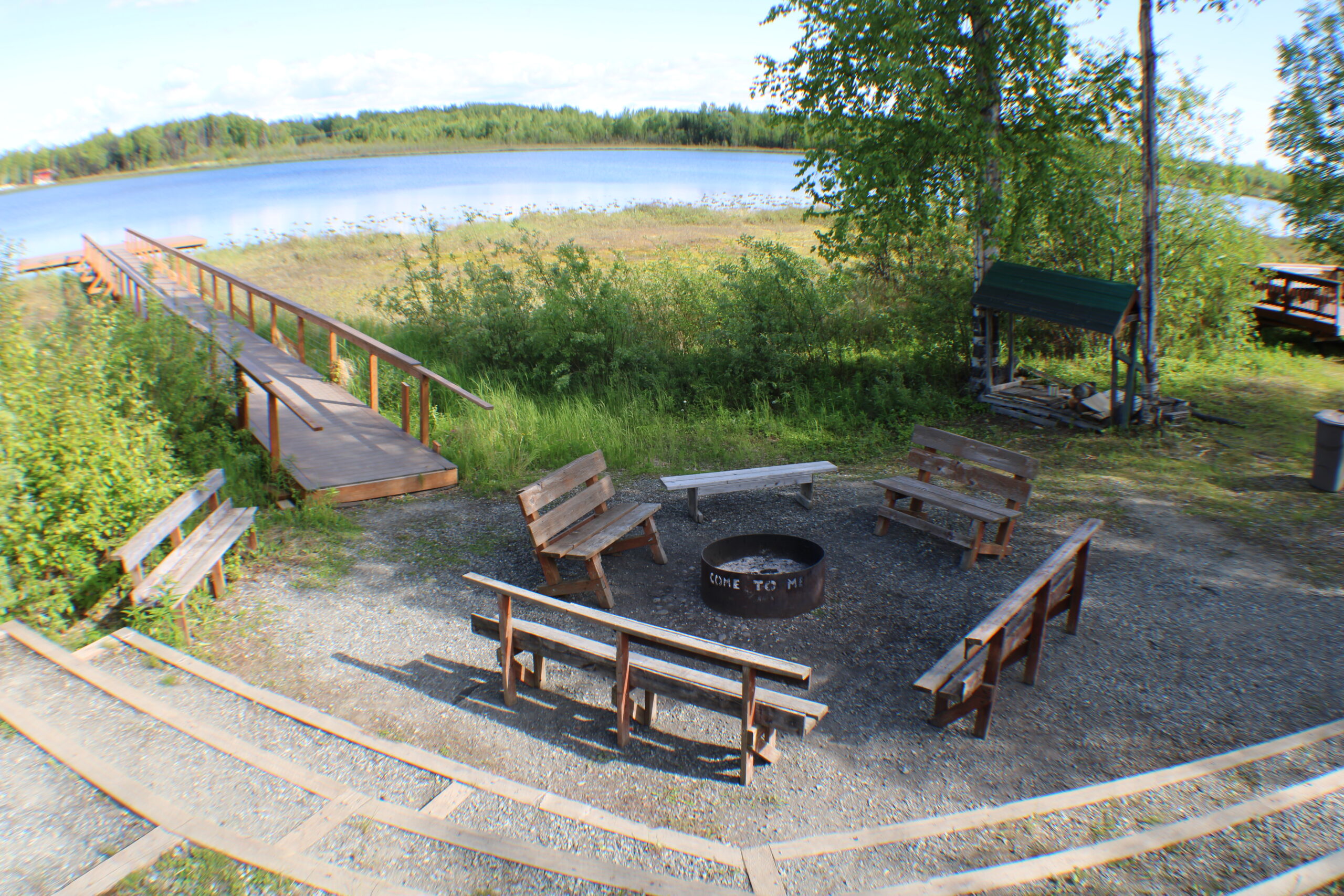 lakeside gazebos, fire pits, benches, a lakeside deck, open-air gathering areas, and wooded spots for personal reflection